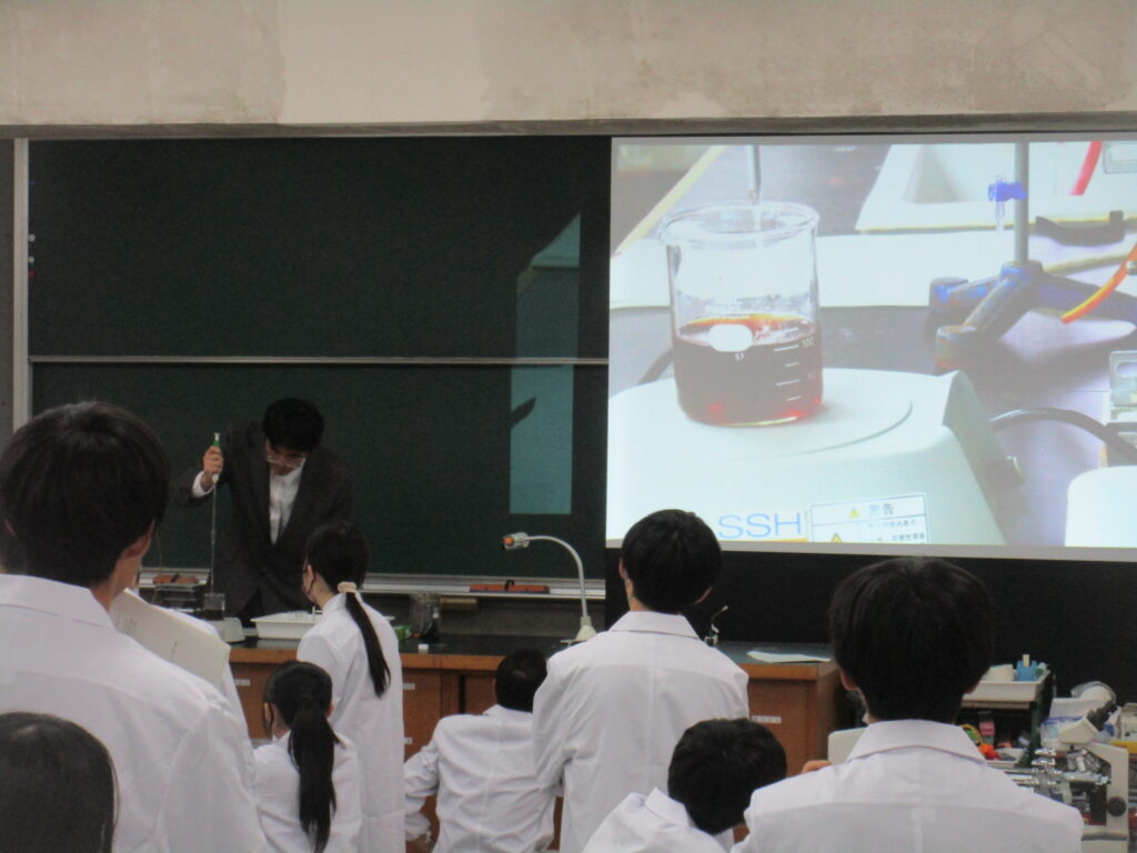 2025年10月22日、千葉県立長生高校2年生の皆様への出前授業を実施しました。これは、将来の科学技術人材の育成を図るために先進的な理数系教育を実施する「スーパーサイエンスハイスクール(SSH)」プログラムに基づくもので、今回は模擬的に作ったかん水からヨウ素を抽出する実験を行い、当社で行われているものに近いヨウ素の製造~分析の方法を体験していただきました。受講した生徒の皆様が、今回の講義によって当社の事業への理解・興味を少しでも深めて下さるようであれば幸いです。